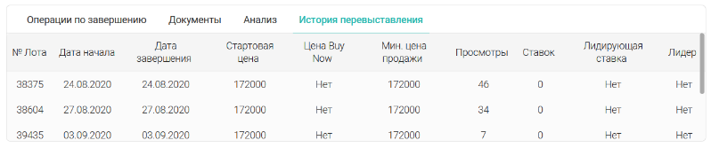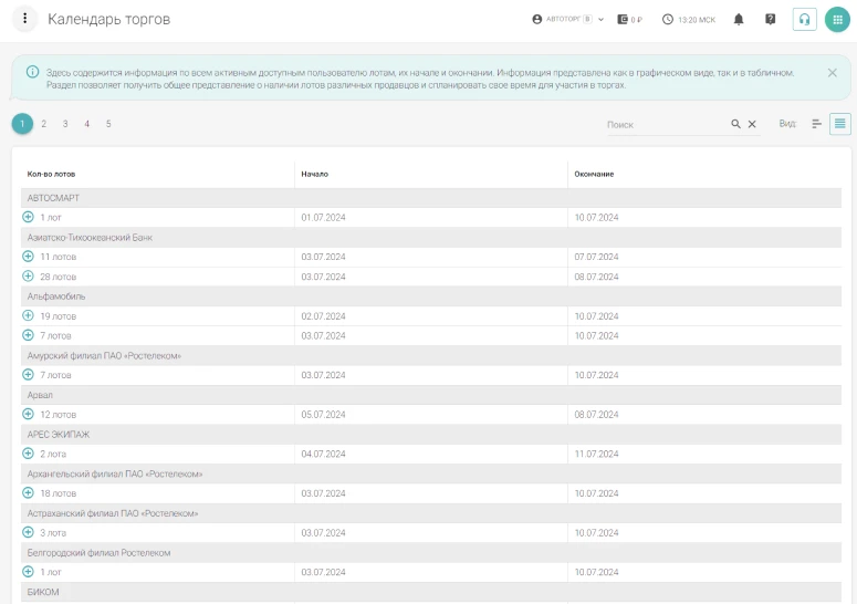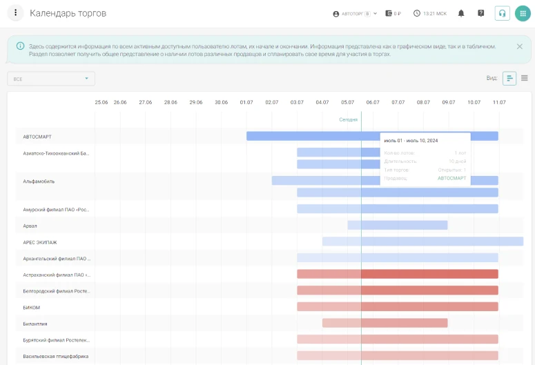 Раздел позволяет получить общее представление о наличии лотов различных продавцов и спланировать свое время для участия в торгах.