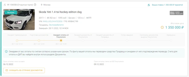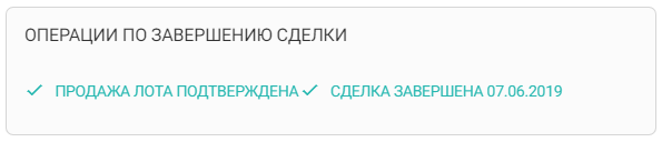 Ответ: После подтверждения со стороны продавца у Вас в личном кабинете в разделе “Я покупаю” будет добавлен данный лот и в разделе «Документы» будут размещены все необходимые документы для оформления сделки. К каждой сделке прикрепляется документ “Порядок оформления”. Просим Вас внимательно ознакомиться с данным документом и следовать инструкции.