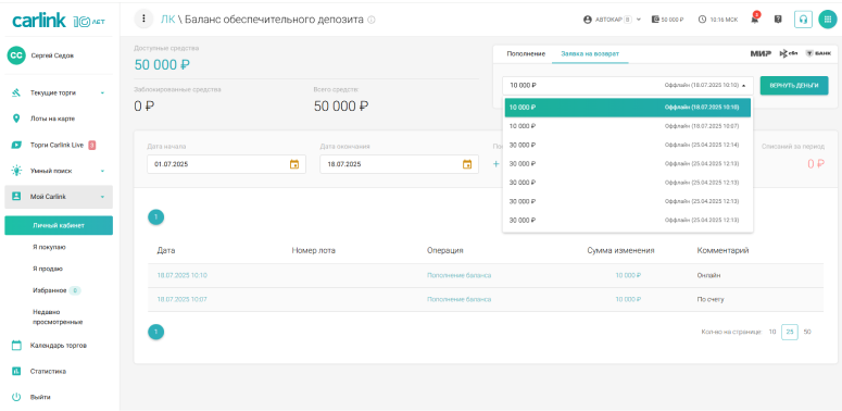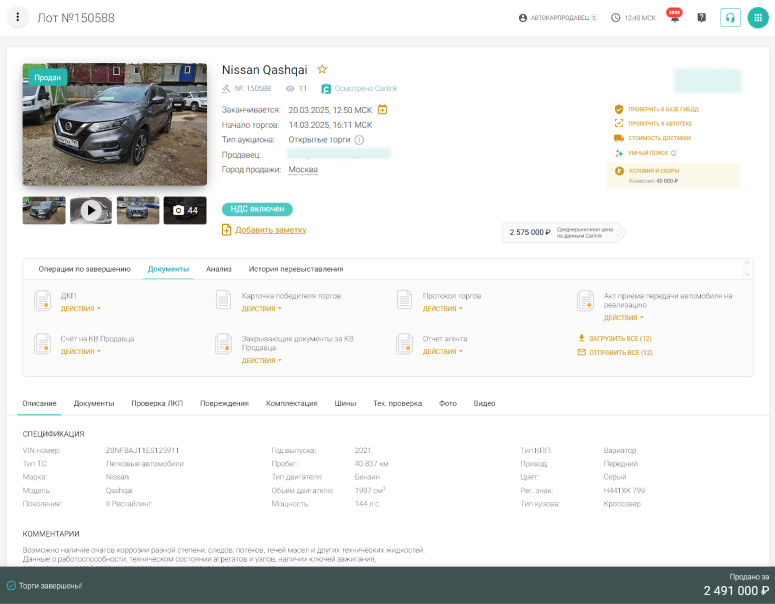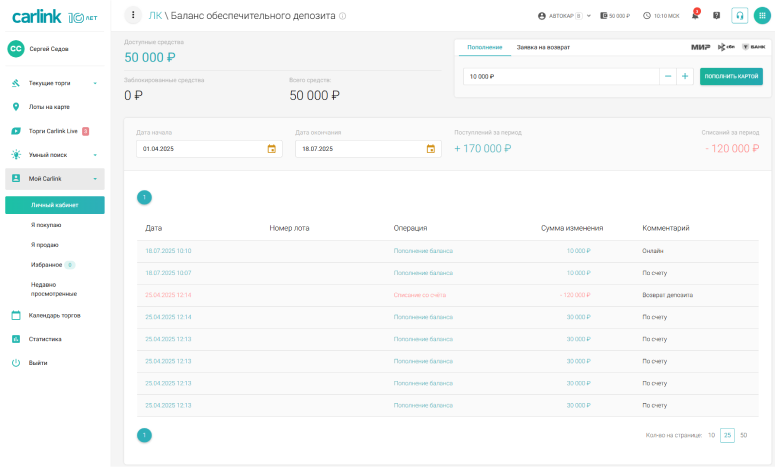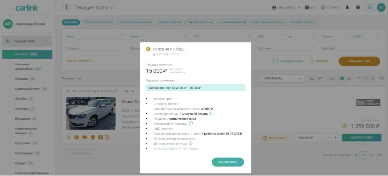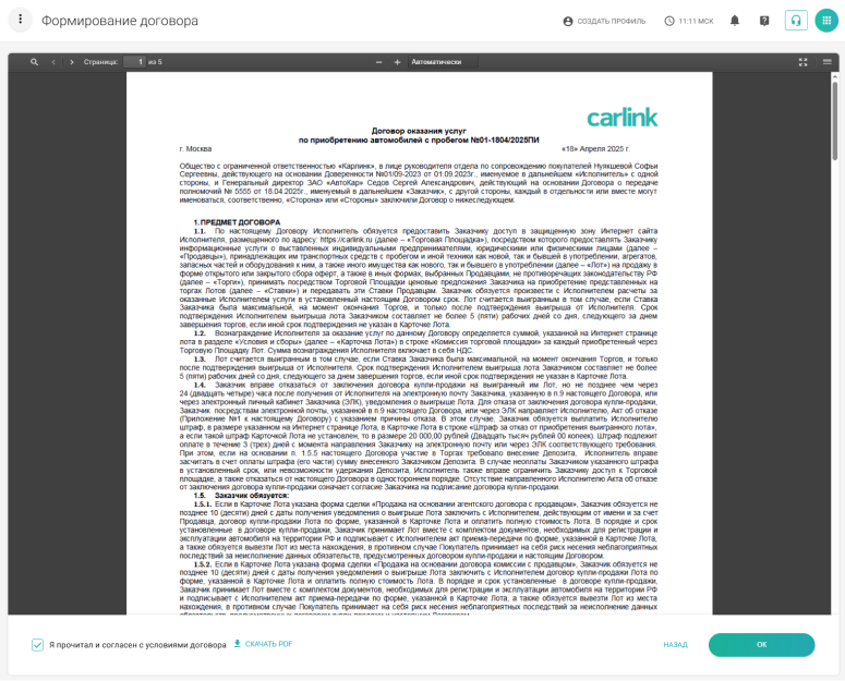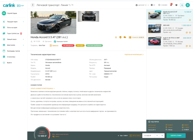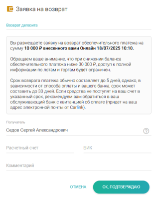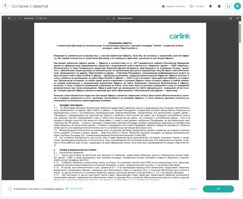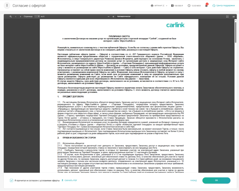 Для получения полного доступа к информации по лотам и участию в торгах необходимо создать профиль физического лица, подписать Публичную оферту о заключении договора на оказание услуг по организации доступа к торговой площадке Carlink, созданной на базе интернет-сайта carlink.ru, а также внести обеспечительный депозит.