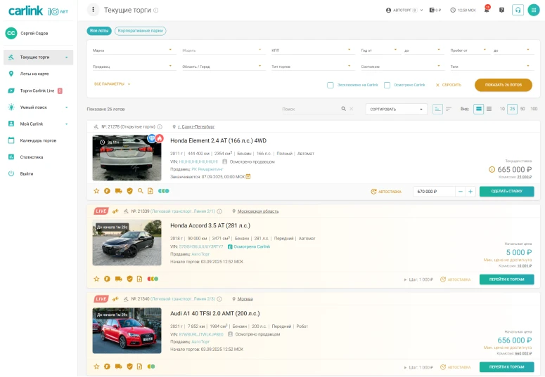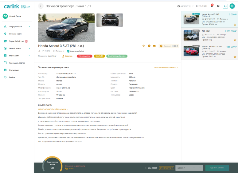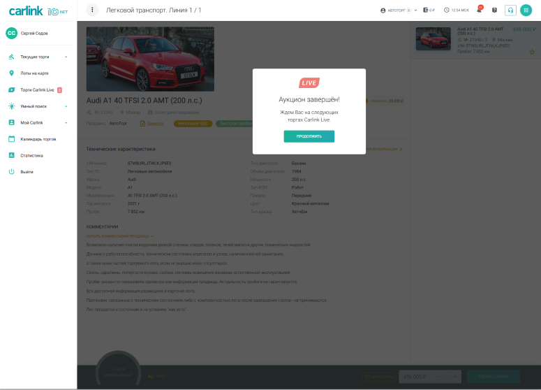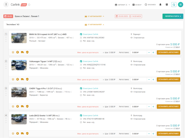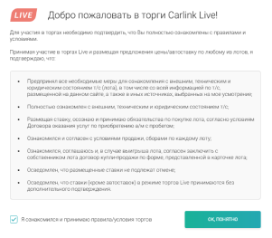 Carlink Live – высокотехнологичный механизм торгов, который позволяет параллельно следить за несколькими аукционами в одном потоке. Дата, время начала торгов и состав аукционируемых лотов заранее анонсируется в данном разделе. В режиме Live лоты выходят на торги в строгой последовательности, следуя друг за другом. Ставки в ходе торгов Live принимаются без дополнительного подтверждения. После начала торгов ставки на лот принимаются только в момент, когда очередь доходит до конкретного автомобиля. При этом время продления аукциона после очередной ставки составляет всего 20 секунд, что обеспечивает скоростное проведение торгов. Подведение итогов происходит в стандартном порядке.