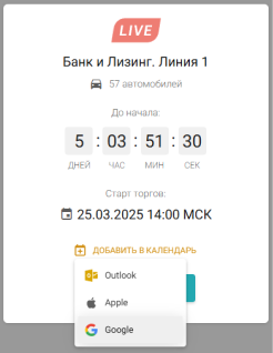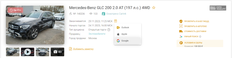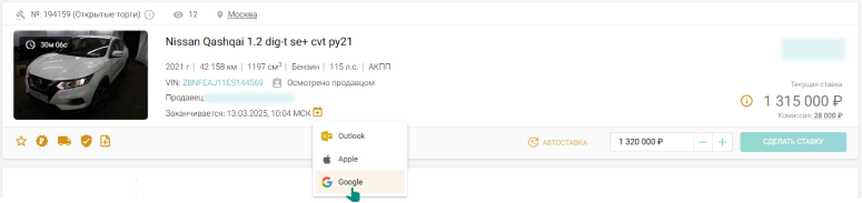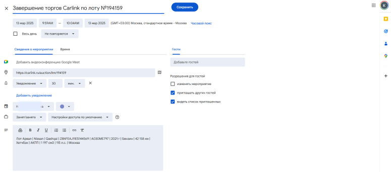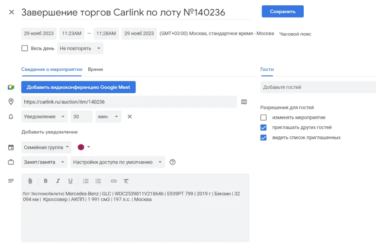 Выбрав удобный вам календарь, вы можете создать напоминание о событии – времени окончания торгов по данному лоту. На рис. показано добавление напоминания на примере календаря Google.