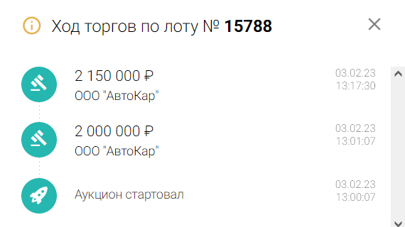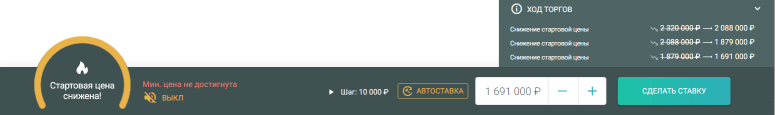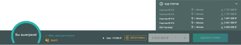 Аукцион проходит на повышение цены от стартовой. В момент начала аукциона у участника появляется возможность сделать ценовое предложение на повышение максимальной цены контракта в размере шага аукциона, который указан для каждого лота. Участник может неоднократно подавать ценовые предложения.