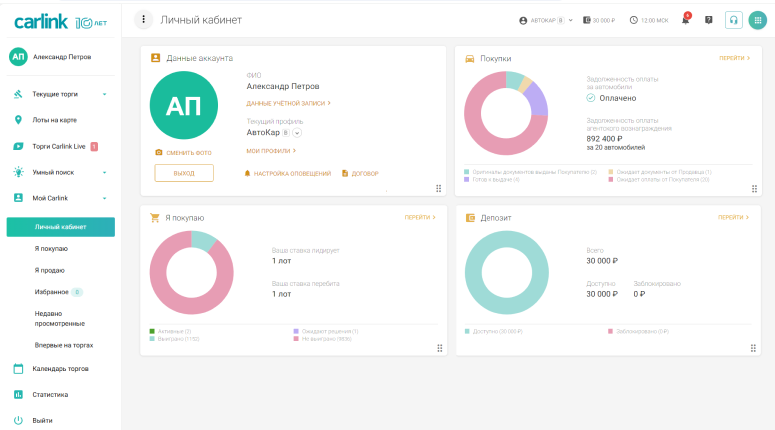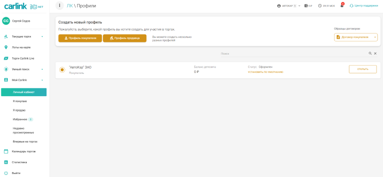 После того как пройдена регистрация, создан профиль покупателя на ЭТП (рис.), заключен договор и внесен обеспечительный депозит (см. баланс депозита), можно принимать участие в торгах на покупку автомобиля.