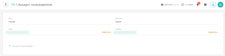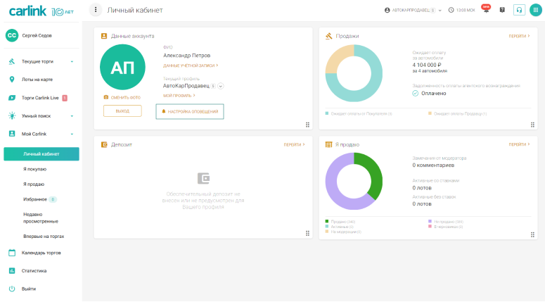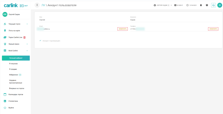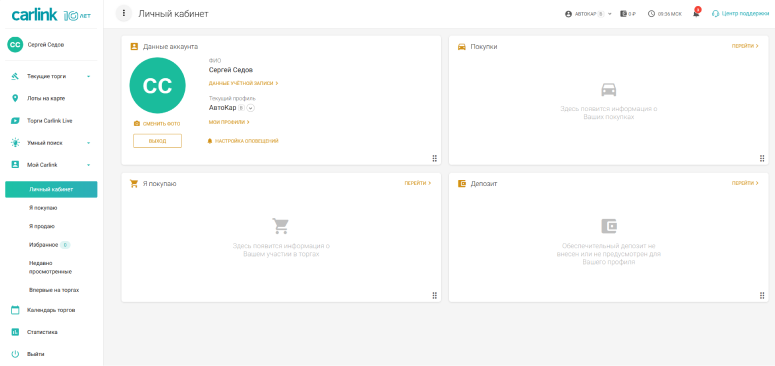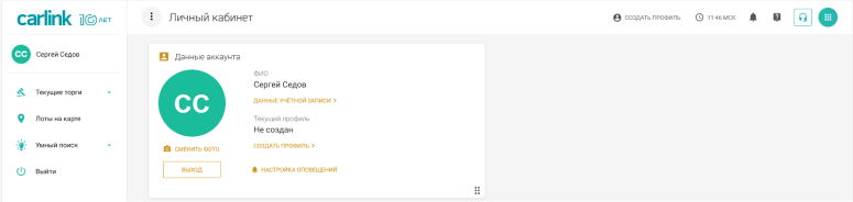 Если Вам необходимо добавить дополнительные ЮЛ, от лица которых Вы планируете участие в торгах, после авторизации на ЭТП, перейдите в раздел «Мой Carlink» -> Личный кабинет, доступный в главном меню (рис.13) и в карточке «Данные аккаунта» нажмите на «Мои профили».