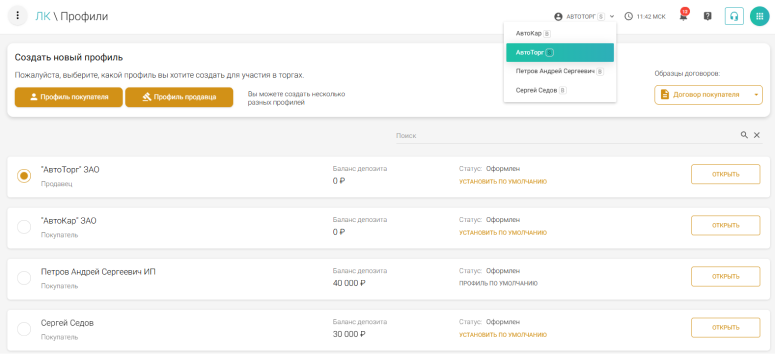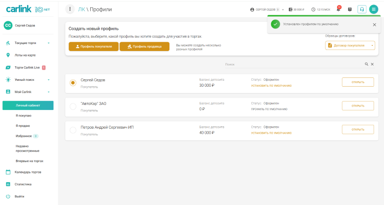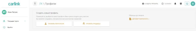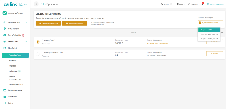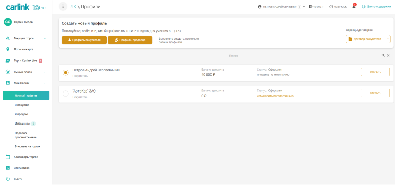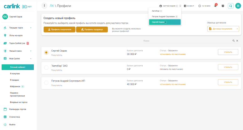 На ЭТП «Карлинк» у одного зарегистрированного пользователя может быть несколько профилей (рис.).