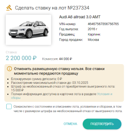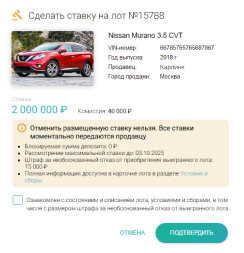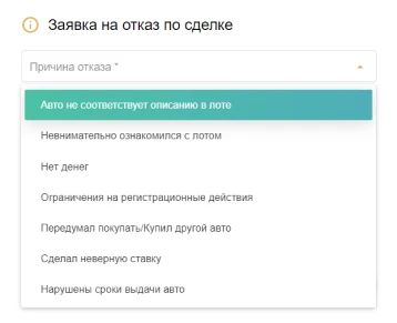 Если отказ от приобретения транспортного средства будет признан необоснованным, вам будет выставлен штраф в размере указанном в описании лота.