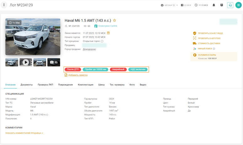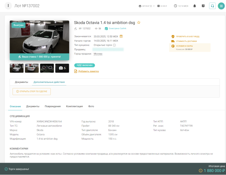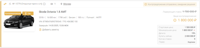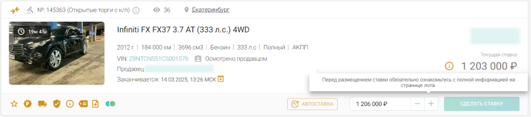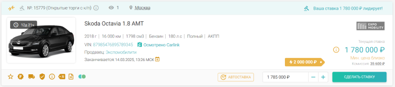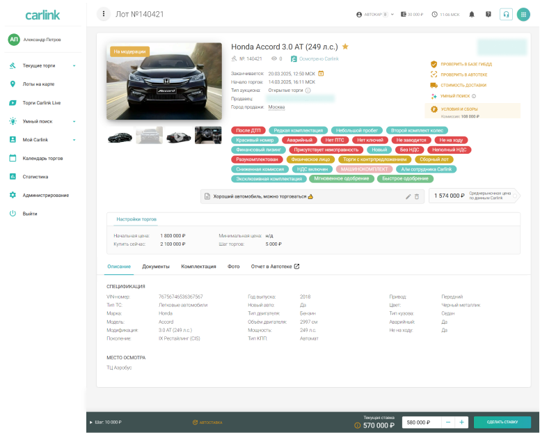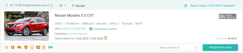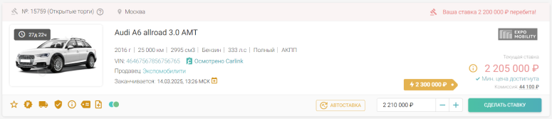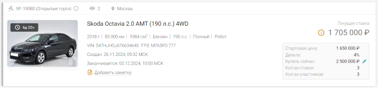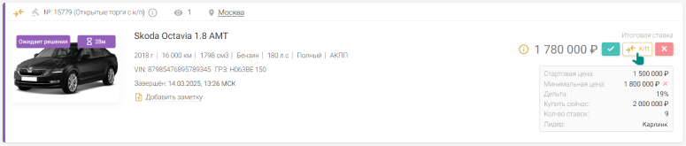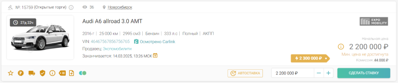 – для справки здесь приведена оценка среднерыночной цены по данным Carlink, которая формируется на основе статистики продаж аналогичных транспортных средств на платформе. Цена не является официальной оценкой стоимости, но помогает сориентироваться и не прогадать в ходе торгов. По наведению на значок