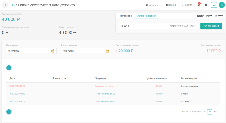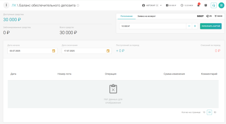 Пополнить депозит можно через Личный кабинет/Баланс обеспечительного депозита.