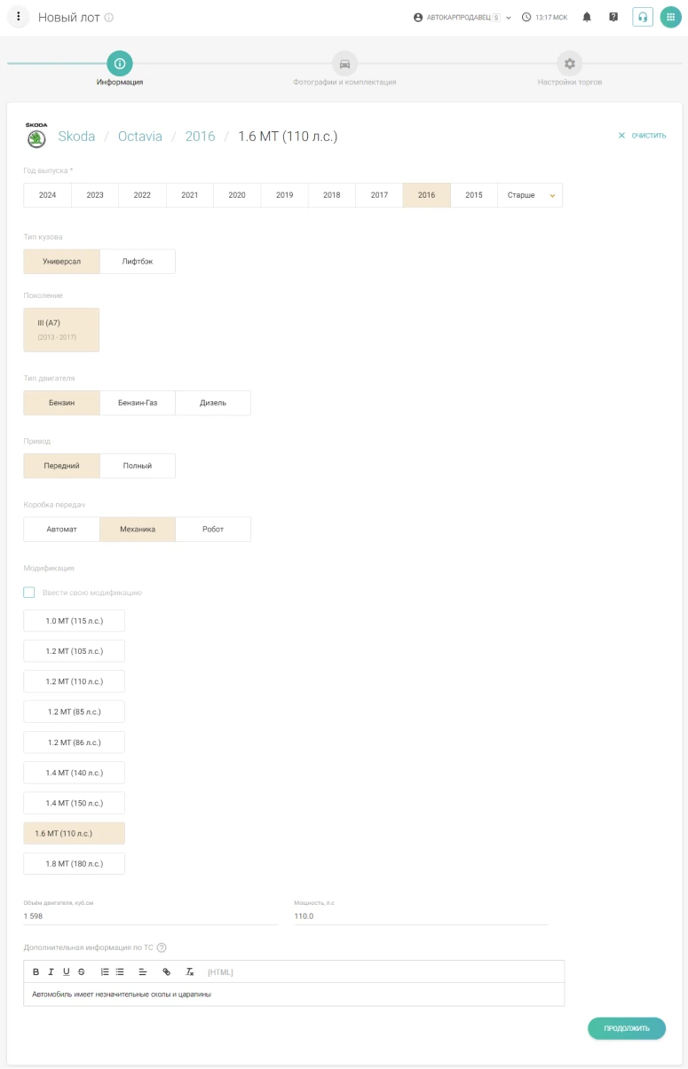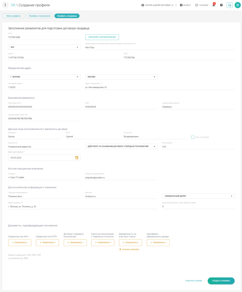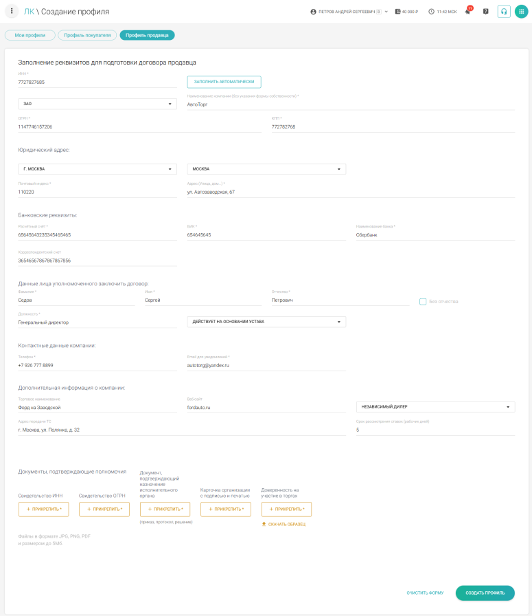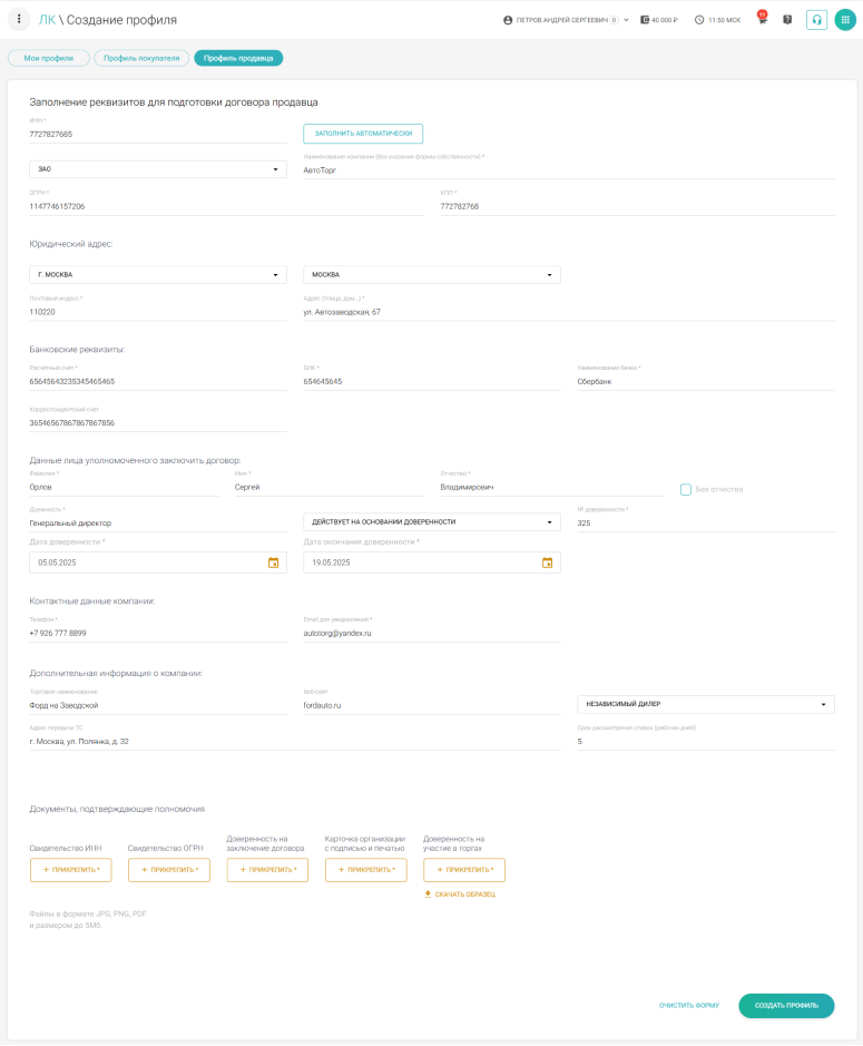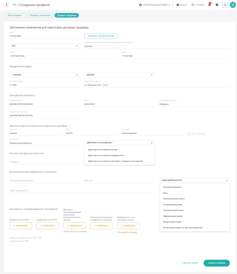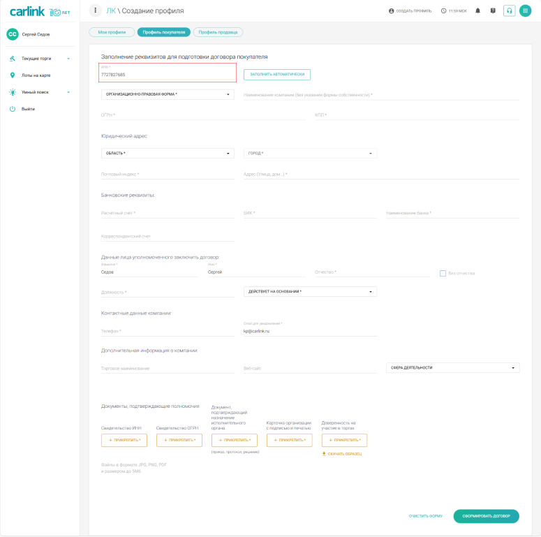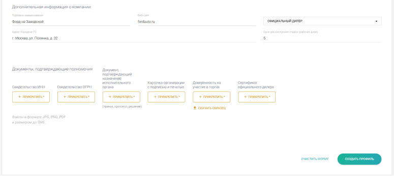 На данном этапе вам необходимо заполнить данные юридического лица (далее – ЮЛ), для формирования договора участия в торгах как Покупателя и последующего использования их в Договорах купли-продажи на выигранные транспортные средства.