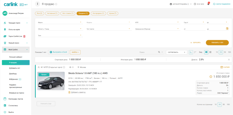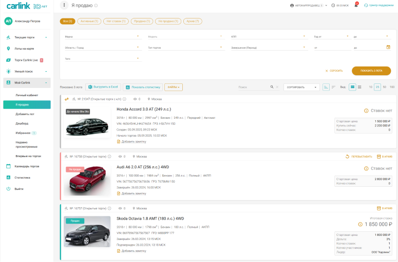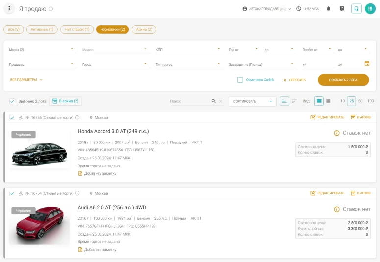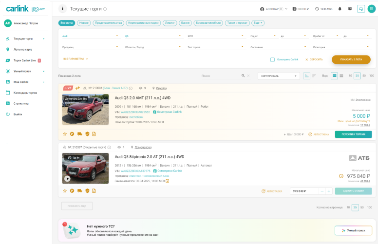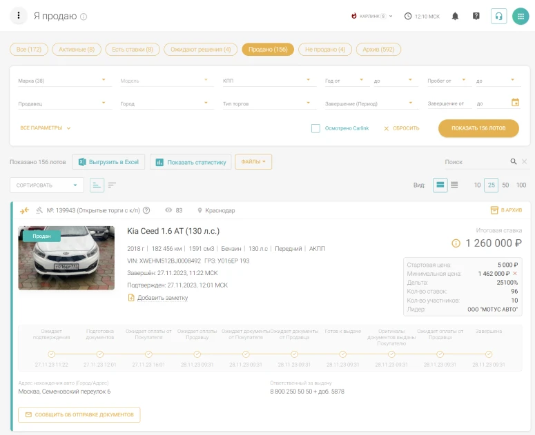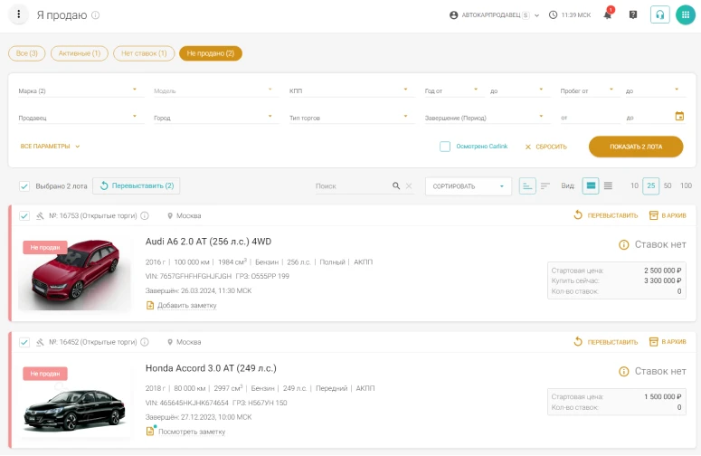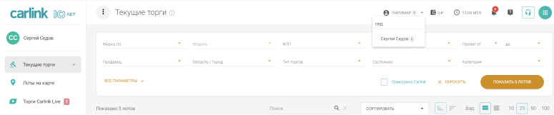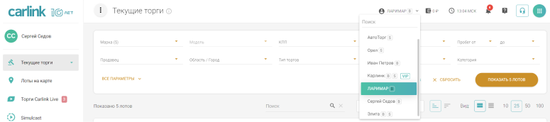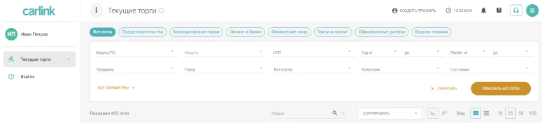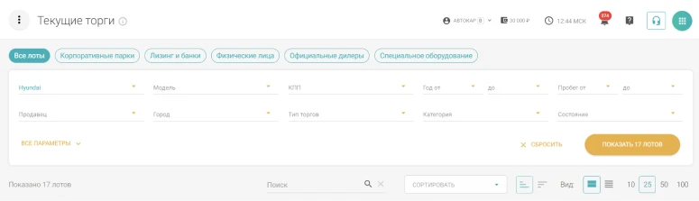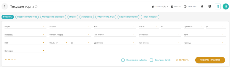 Также на странице доступна фильтрация по основным параметрам лотов.