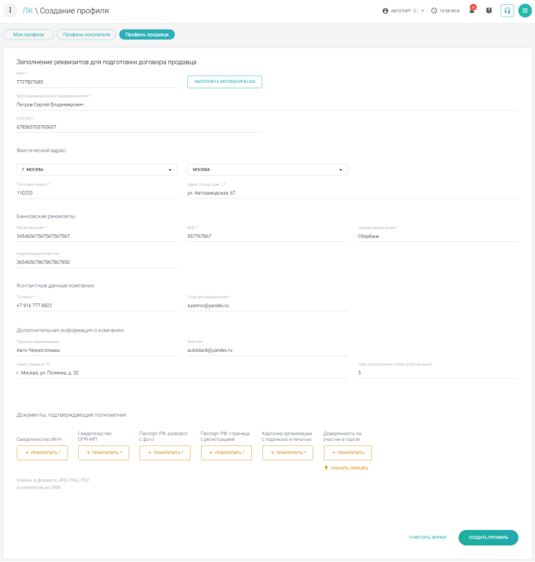 На данном этапе вам необходимо заполнить данные индивидуального предпринимателя (далее – ИП), для формирования договора участия в торгах как Покупателя и последующего использования их в Договорах купли-продажи на выигранные транспортные средства.