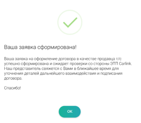Ваша заявка на оформление Договора будет отправлена на обработку администрации ЭТП, после чего специалист свяжется с вами для того, чтобы завершить оформление и предоставить дальнейшие инструкции по участию в торгах.