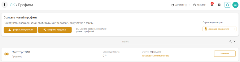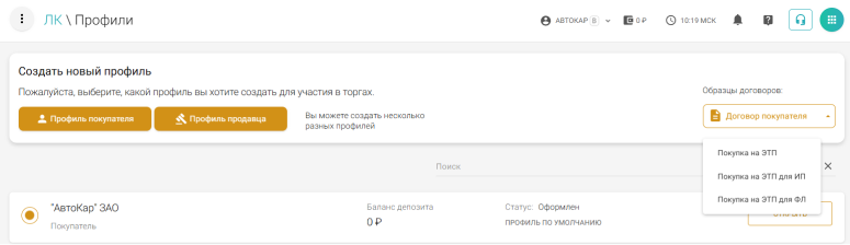 Обратите внимание, что на странице «Профили» (рис.) можно также ознакомиться с образцами договоров.