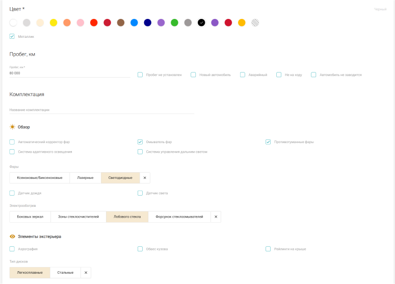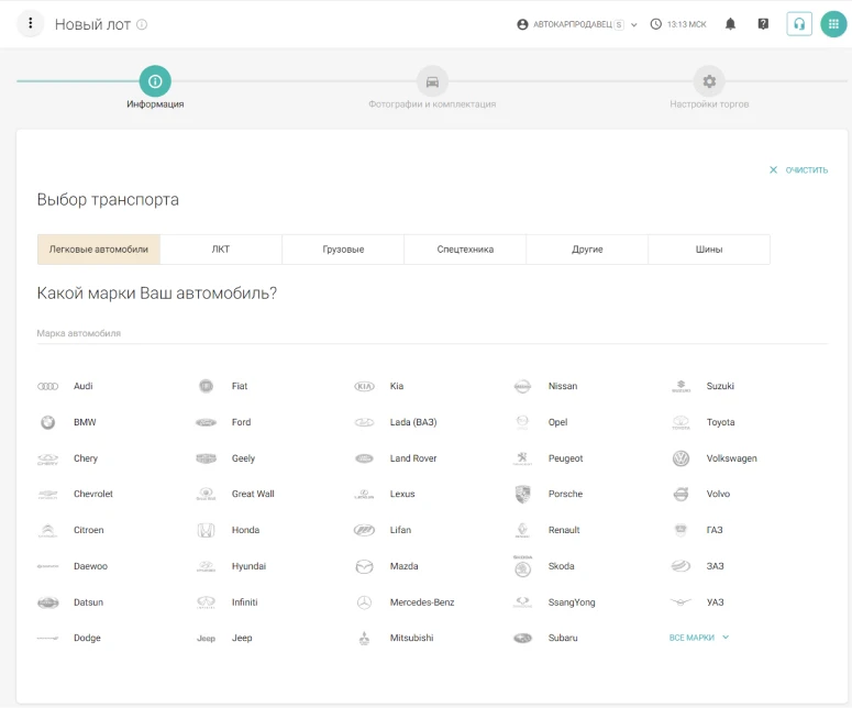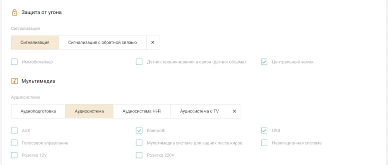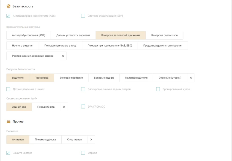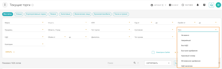 Кроме этого, сверху от основного фильтра выведены кнопки быстрого фильтра по категориям лотов, такие как «Бронеавтомобили», «Корпоративные парки», «Лизинг и банки», «Такси и прокат» и т.д. Данные кнопки повторяют поле «Категория» основного фильтра.