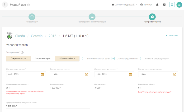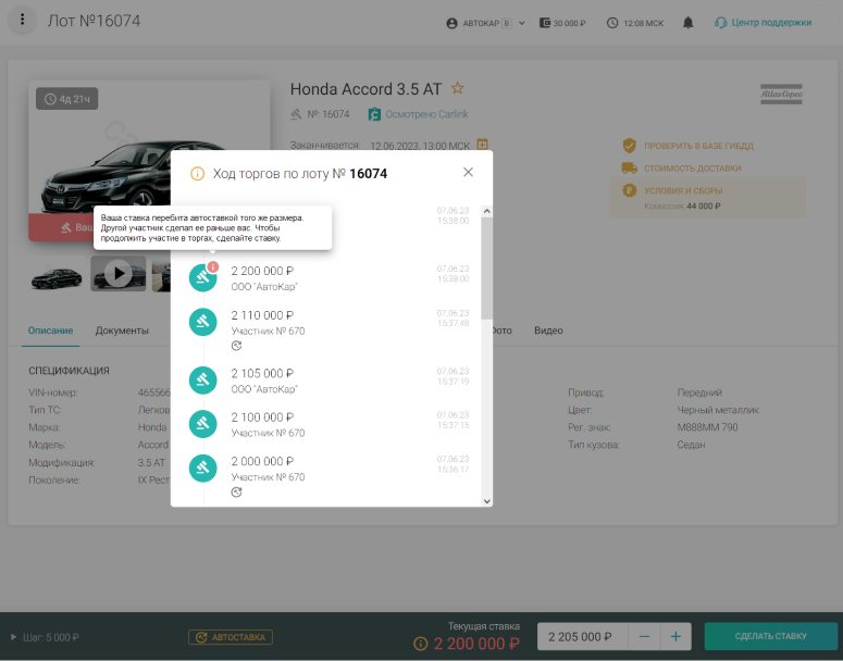 Шаг торгов – минимальный интервал увеличения ставки (обычно кратно 1000).