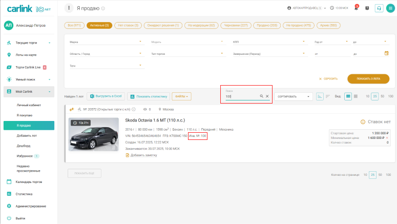 Установив необходимые параметры, на экран выведутся все лоты под индивидуальный запрос.