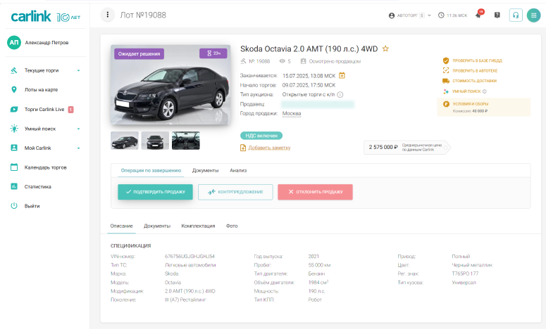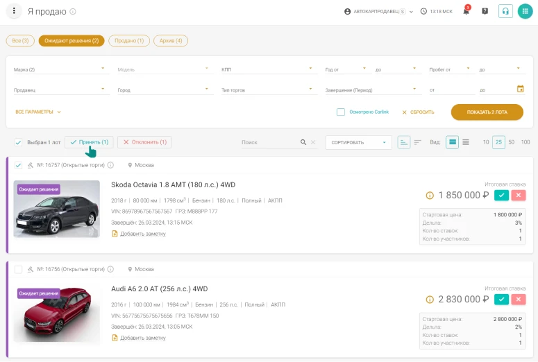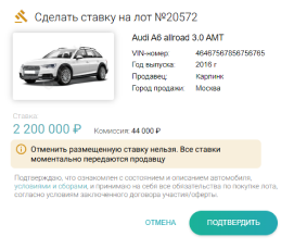 В случае, если подтверждение ставки со стороны продавца отсутствует, рекомендуем Вам ожидать. Существует вероятность того, что продавец откажется от продажи транспортного средства. Тогда сделка не состоится и Вам будет возвращен депозит.