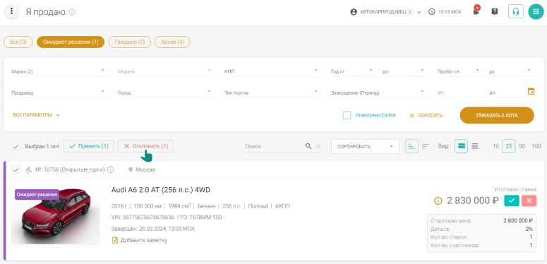 Если сделка подтверждена, то для отказа от приобретения Вам необходимо написать электронное письмо на corporate@carlink.ru с электронной почты, указанной при регистрации. В письме необходимо указать номер лота или VIN номер автомобиля. Либо оформить отказ в карточке лота.