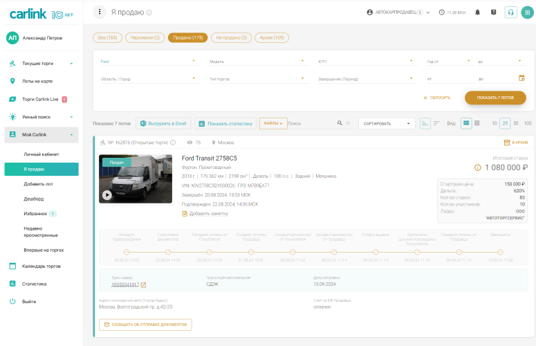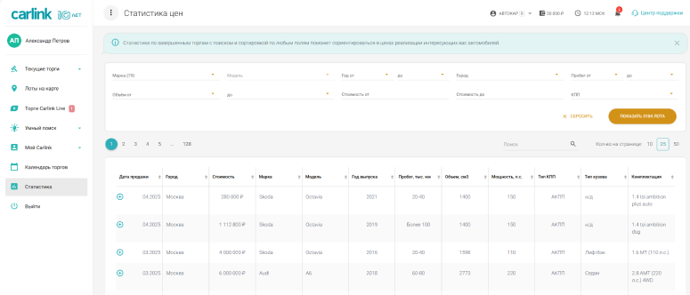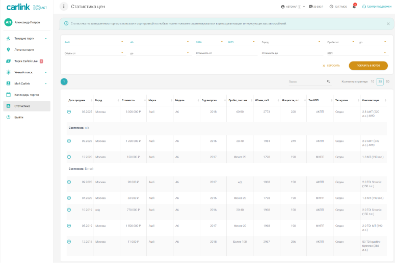 В разделе «Статистика» ведется информация по всем проданным на площадке автомобилям за все время.