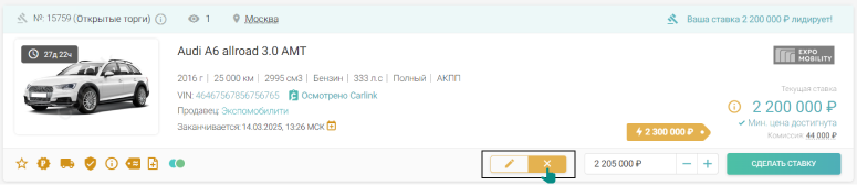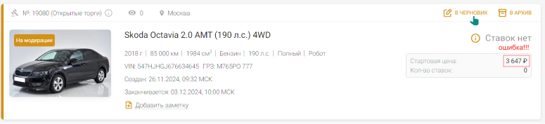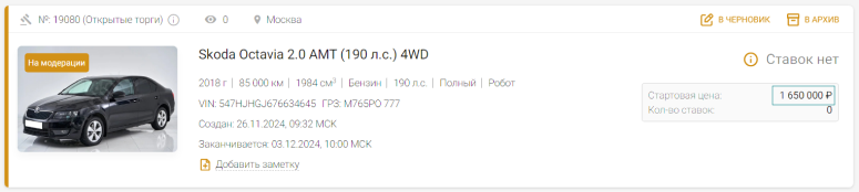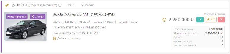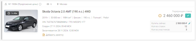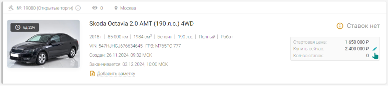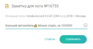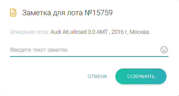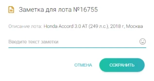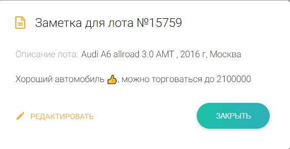Обратите внимание, что заметка на лоте видна только вам, точнее всем пользователям одного профиля. Это удобно, когда в компании есть оценщик – пользователь, прикрепленный к профилю компании.