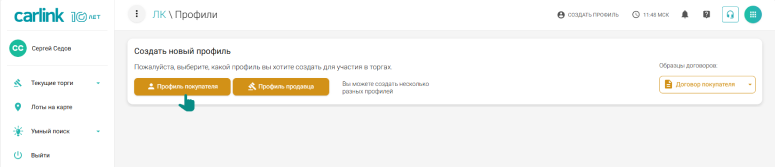Для того чтобы перейти к заполнению формы создания профиля, необходимо нажать на «создать профиль» в навигационной панели или на виджете «Данные аккаунта» в Личном кабинете (перейти в личный кабинет можно по клику на имя пользователя в главном меню) (рис.). Далее на открывшейся странице ЛК\Профили на форме «Создать новый профиль» необходимо нажать на кнопку «Профиль покупателя» (рис.). Кроме этого на данной форме можно ознакомиться с образцами договоров. После этого, на странице ЛК\Создание профиля (рис.) можно ознакомиться с остальными условиями участия для ФЛ, ИП и ЮЛ, – выбрать нужную вам форму, нажав на кнопку «Создать профиль ЮЛ» и заполнить форму для подготовки договора Покупателя.
