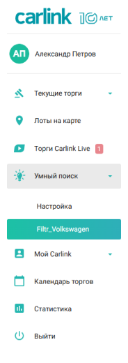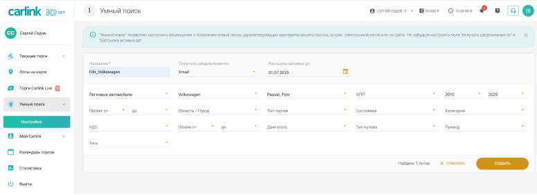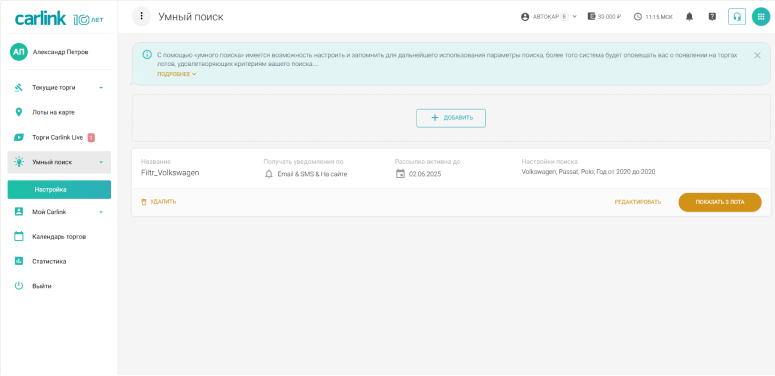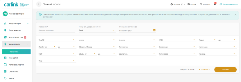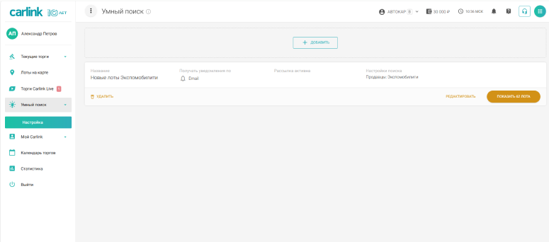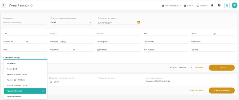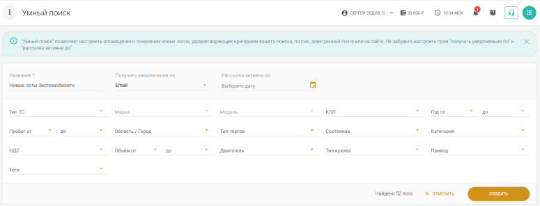Умный поиск - настройка и запоминание для дальнейшего использования параметров фильтра, с оповещением системой о появлении на торгах лотов, удовлетворяющих критериям вашего поиска.