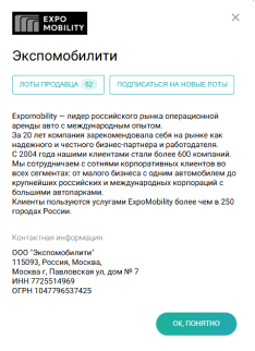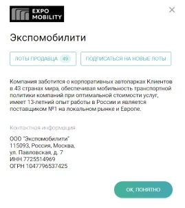Кликнув по полю «Продавец» вы можете узнать подробную информацию по ней (рис.). Также, вы можете посмотреть все лоты продавца и оформить подписку на новые лоты (подробнее см. в разделе «умный поиск»).