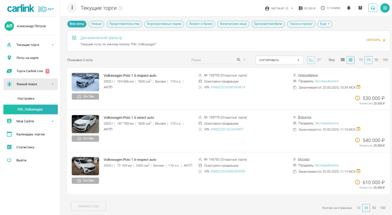 В данном примере найдено 3 лота (рис.). Подсчет количества попадающих под критерии отбора происходит автоматически. При сохранении фильтра можно отобразить найденные лоты. По нажатию кнопки «показать 3 лота» (рис.) вы увидите все участвующие в торгах и попадающие под ваш запрос автомобили на странице списка лотов (рис.). Нажав «сбросить» (значок