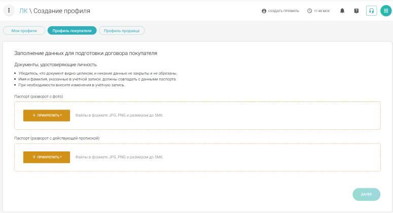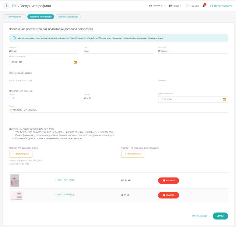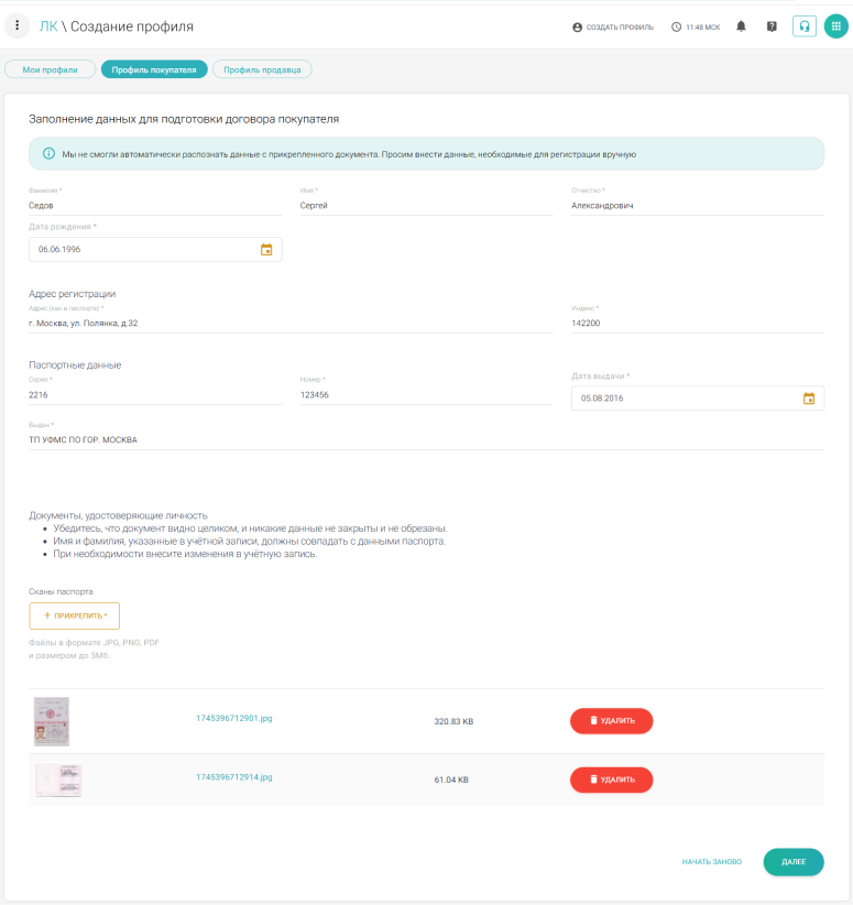После того как вы прикрепили документ, удостоверяющий личность – запустится процесс распознавания данных. В случае успешного завершения процесса отобразится форма с заполненной информацией для создания профиля покупателя. Необходимо внимательно ознакомиться и проверить данные на корректность и при необходимости отредактировать.