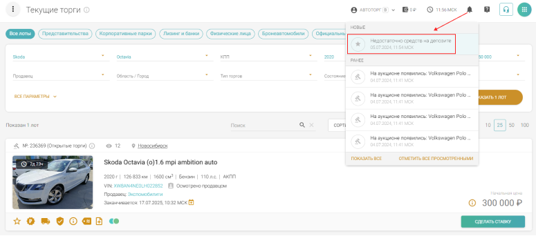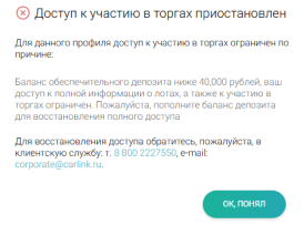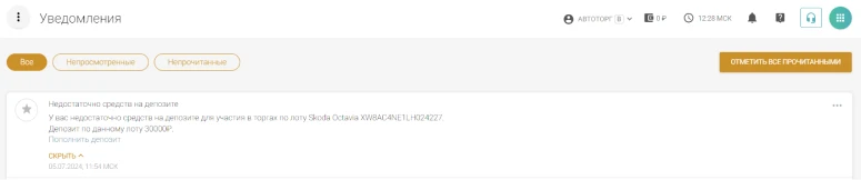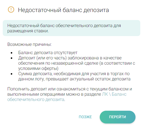 В случае, если свободных средств на депозите недостаточно для участия в торгах (рис.), вы получите уведомление (рис., ).