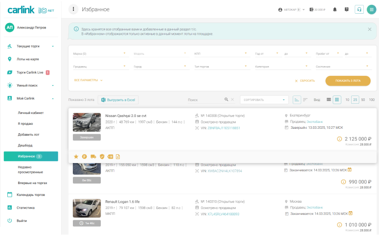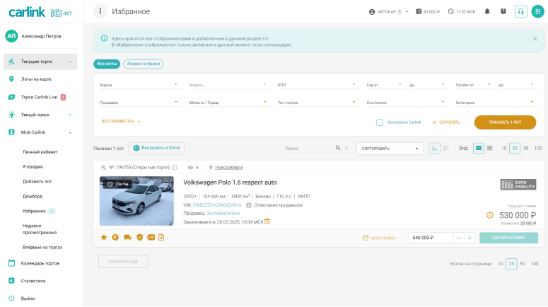 Имейте в виду, что в «избранном» отображаются только активные в данный момент лоты на площадке.