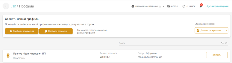 Для того чтобы перейти к заполнению формы создания профиля, необходимо нажать на «создать профиль» в навигационной панели или на виджете «Данные аккаунта» в Личном кабинете (перейти в личный кабинет можно по клику на имя пользователя в главном меню) (рис.). Далее на открывшейся странице ЛК\Профили на форме «Создать новый профиль» необходимо нажать на кнопку «Профиль покупателя» (рис.). Кроме этого на данной форме можно ознакомиться с образцами договоров. После этого, на странице ЛК\Создание профиля (рис.) можно ознакомиться с остальными условиями участия для ФЛ, ИП и ЮЛ, – выбрать нужную вам форму, нажав на кнопку «Создать профиль ИП» и заполнить форму для подготовки договора Покупателя.