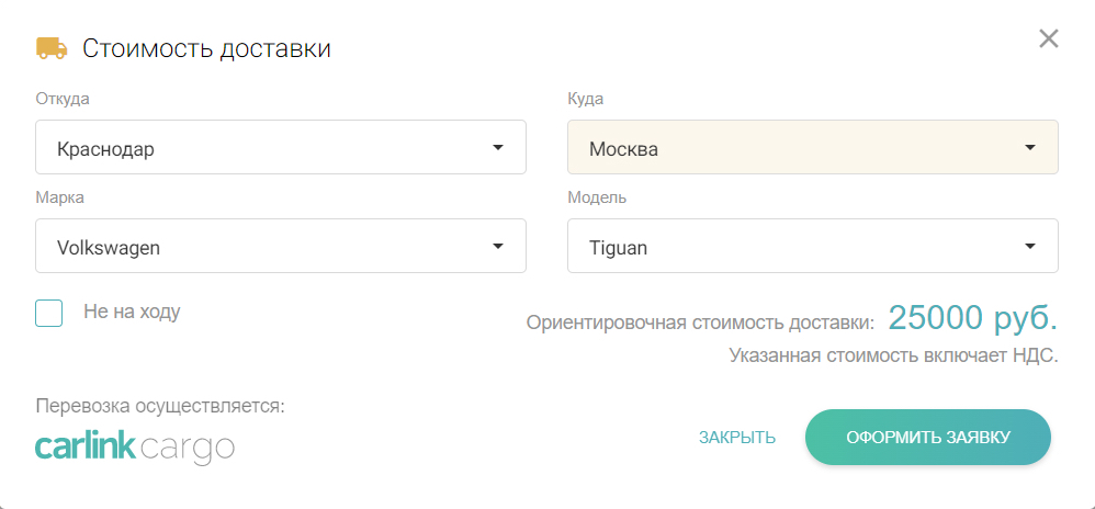 Имеется возможность оформить заказ на перевозку, для этого необходимо перейти на соответствующий раздел сайта по ссылке с логотипом «carlink cargo».