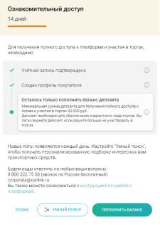 Обратите внимание на необходимость внесения обеспечительного депозита (см. баланс депозита). Пока вы не пополнили баланс, вам будет предоставлен 14-дневный ознакомительный доступ (рис.) с ограничением отображения части информации о лотах (VIN, Продавец и раздел Документы будут скрыты). После внесения обеспечительного депозита можно принимать участие в торгах на покупку автомобилей с полным доступом к информации платформы.