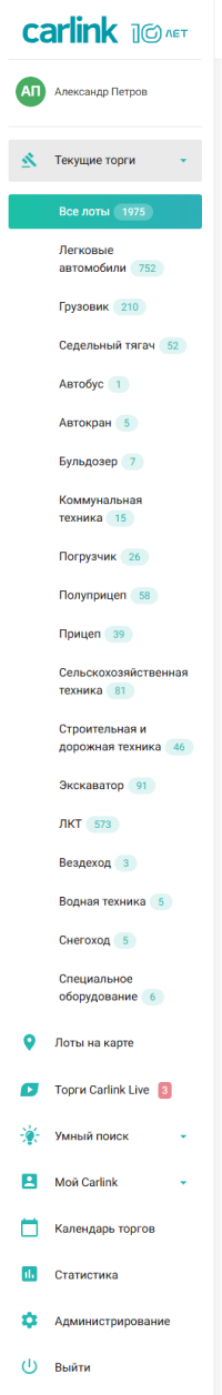 В меню «Текущие торги» также могут присутствовать предустановленные фильтры по типам транспортных средств, такие как «Легковые автомобили», «ЛКТ», «Грузовик», «Автобус», «Прицеп», «Строительная и дорожная техника» и т.д. (рис.).