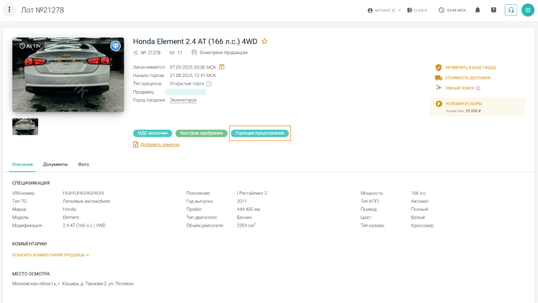 выделяются лоты, на которые действует ограниченное по времени выгодное предложение. Наличие данной метки также отображается тегом в краткой карточке лота (рис.). Такие лоты можно выбрать, если использовать фильтр для поиска по тегу «Горящее предложение» (рис., ).