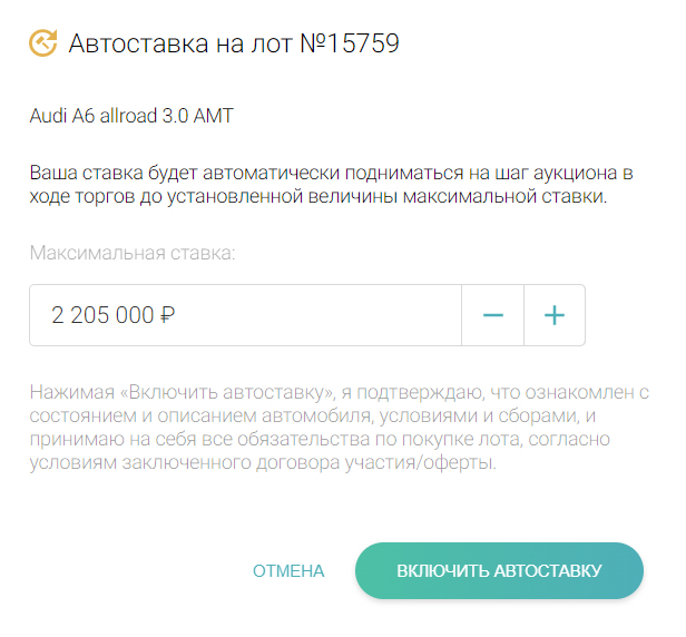 Автоставка (прокси ставка) – установленная покупателем максимальная ставка, которая будет автоматически подниматься в ходе торгов до указанной величины. Применяется только в открытых аукционах.