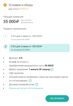 Во всех аукционных лотах применяется тарифная сетка, в которой предусмотрены как динамически изменяемые комиссии в процентах от текущей ставки по лоту, так и фиксированные.