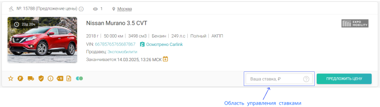 При отображении лотов в табличном виде (рис.) для отображения области управления ставками нужно навести курсор на лот (рис.).